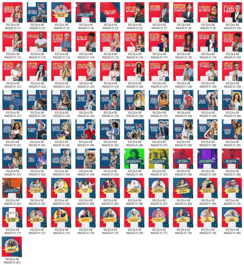 Arts prontas e editáveis para escola de inglês (mas você pode usar para qualquer outro nicho e categoria, basta editar) ESCOLA DE INGLÊS 01 – 81 TEMPLATES PSD 5.81 GB em Arquivos ANTERIOR PRÓXIMO Página Inicial