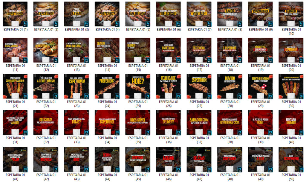 Arts prontas e editáveis para espetaria (mas você pode usar para qualquer outro nicho e categoria, basta editar) ESPETARIA 01 – 50 TEMPLATES PSD 11.2 GB em Arquivos ANTERIOR PRÓXIMO Página Inicial