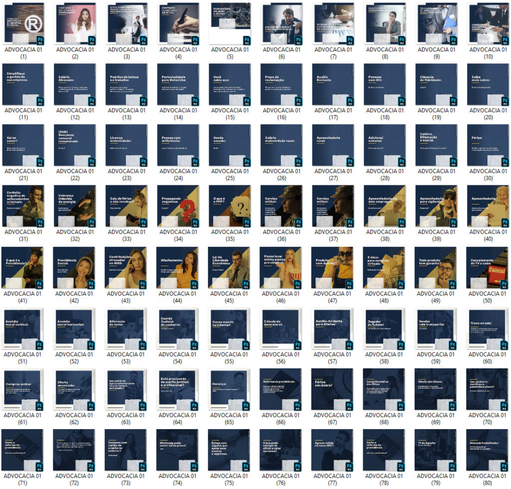 Arts prontas e editáveis de advocacia (mas você pode usar para qualquer outro nicho e categoria, basta editar) ADVOCACIA 01 – 80 TEMPLATES PSD 3.62 GB em Arquivos ADVOCACIA 02 – 38 TEMPLATES PSD 932 MB em Arquivos ANTERIOR PRÓXIMO Página Inicial